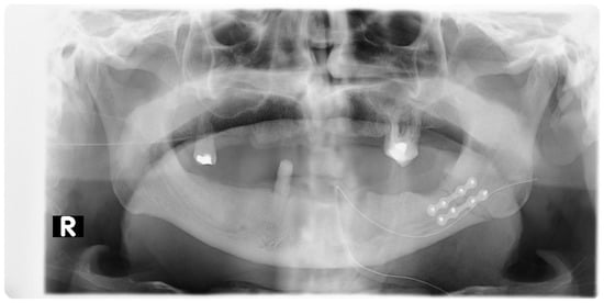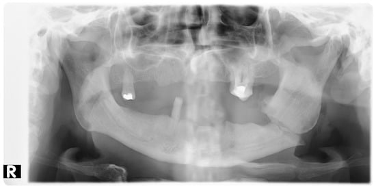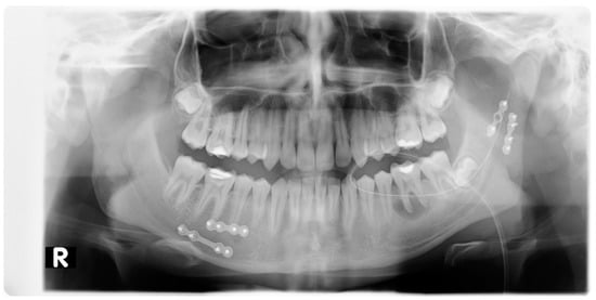 Pantomographic image showing mandible miniplate osteosyntheses with screws: 2 miniplates with 8 screws near tooth 45 and 2 miniplates with 6 screws at the base of the mandibular condyle. R—right side