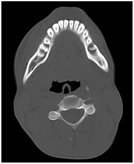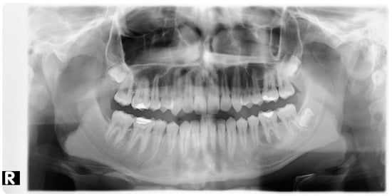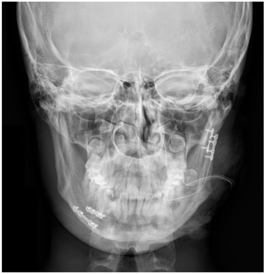 All patients (100%) included in the study were otherwise healthy (Table 1). Eleven (55%) declared that they smoked cigarettes on a regular basis. All the patients were subjected to examinations such as pantomographic X-ray (Figure 2, Figure 3 and Figure 4, computed tomography (Figure 5 and Figure 6), pantomographic X-ray (Figure 7), mandible X-ray in posterior–anterior projection (Figure 8), blood morphology and coagulation testing, analysis of electrolyte levels (Table 1), and electrocardiography. One day before the procedure, they were administered an antibiotic (cefazolin, 2 × 1.0 g iv) and a proton pump inhibitor with stomach-protective function (esomeprazole, 1 × 40 mg iv). All of the patients were operated on about 4 days from the injury under general endotracheal anesthesia. As a part of premedication, they were administered 7.5 mg midazolam approximately 40 min before the procedure. Mandibular fractures were dressed through open reposition and osteosynthesis of the fragments via miniplates and titanium screws. Eleven patients (55%) had teeth remaining in the fracture gap. On the day of the procedure, the antibiotic and gastroprotective drug were again administered to the patients. In addition, an analgesic was introduced (ketoprophen, 3 × 100 mg iv). A day after the procedure, the patients received 1 dose of dexamethasone—4 mg iv, and 2 days after the procedure, 1 dose of dexamethasone—2 mg iv. The antibiotic, gastroprotective drug, and analgesic (vitamin C, 3 × 300 mg) continued to be administered to the patients throughout their stay at the hospital. All of the patients had intermaxillary tractions installed on the MMF (maxillomandibular fixation) screws during the procedure. The tractions were kept for a period of about 2 weeks.