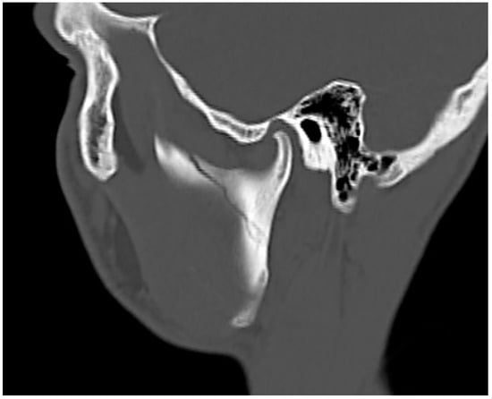 Computed tomography showing the presence of a linear fracture gap at the base of the left mandibular condyle without splinter displacement.