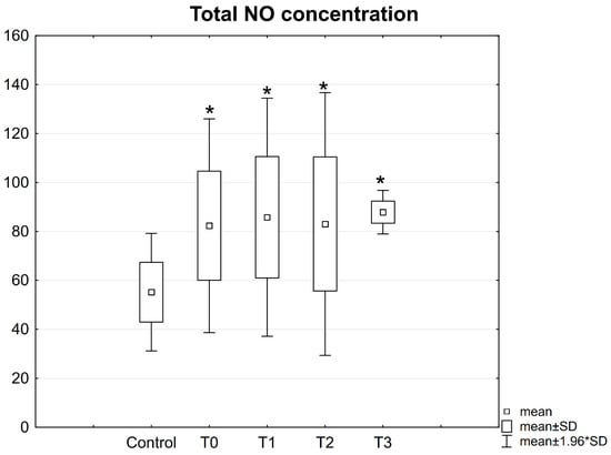 Concentrations of total NO in the serum of patients with mandible factures. All data are expressed as mean ± SD. Patients group: before surgery (T0), at 24 h after surgery (T1), at 2 weeks (T2), and 6 weeks (T3) after surgery. *—statistical differences with control.