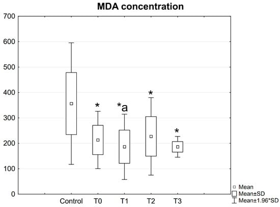 Concentrations of MDA in the serum of patients with mandible factures. All data are expressed as mean ± SD. Patients group: before surgery (T0), at 24 h after surgery (T1), at 2 weeks (T2), and 6 weeks (T3) after surgery. *—statistical differences with control; a—statistical differences between patients before surgery (T0) and at 24 h after surgery (T1).