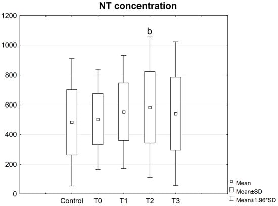 Concentrations of NT in the serum of patients with mandible factures. All data are expressed as mean ± SD. Patients group: before surgery (T0), at 24 h after surgery (T1), at 2 weeks (T2), and 6 weeks (T3) after surgery. b—statistical differences between patients before surgery (T0) and at 2 weeks after surgery (T2).
