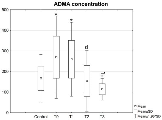 Concentrations of ADMA in the serum of patients with mandible factures. All data are expressed as mean ± SD. Patients group: before surgery (T0), at 24 h after surgery (T1), at 2 weeks (T2), and 6 weeks (T3) after surgery. *—statistical differences with control; c—statistical differences between patients before surgery (T0) and at 6 weeks after surgery (T3), d—statistical differences between patients at 24 h after surgery (T1) and at 2 weeks after surgery (T2); f—statistical differences between patients at 24 h after surgery (T1) and at 6 weeks after surgery (T3).