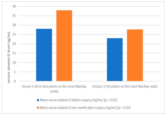 The mean serum vitamin D level in patients in group 2 before surgery was lower (23.01 ng/mL) than in group 1 (28.02 ng/mL) (p < 0.05) (Table 2, Figure 1). These patients also presented a higher degree of advancement of changes in all the above scales, i.e., before the Lund-Kennedy procedure: group 1: 3.21, group 2: 6.30 (p < 0.05) (Table 3, Figure 2); SNOT 20 mean: group 1: 30.33, group 2: 31.80 (Table 4, Figure 3). One month after the surgery, an increase in vitamin D levels was observed in both study groups: in group 1, on average, to the value of 37.98 ng/mL (p < 0.002); and in group 2: 27.67 ng/mL (p < 0.004) (Table 2, Figure 1). Patients with lower vitamin D levels show a higher degree of severity of changes in the Lund-MacKay, Lund-Kennedy scale and in the SNOT 20 questionnaire (Figure 1, Figure 2 and Figure 3).