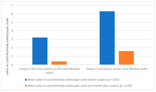 Mean value in Lund-Kennedy endoscopic scale before and one month after surgery in group 1 and 2 (graph).