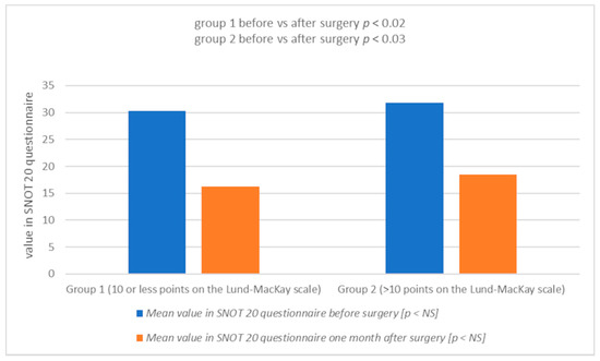 Mean value in the Sinonasal Outcome Test SNOT 20 questionnaire before and one month after surgery in group 1 and 2 (graph; NS: not significant).