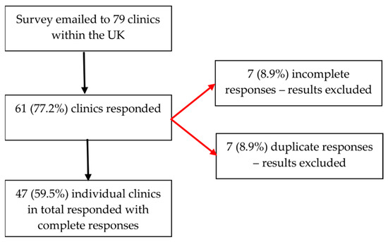 Sixty-one out of the 79 clinics responded, fourteen responses were excluded (seven incomplete and seven duplicate), leaving the final number of responses analysed as 47 (Figure 1).
