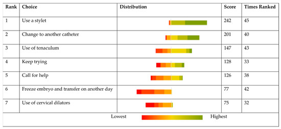 The frequent use of a tenaculum in some units is another concern. The use of a tenaculum is not only painful but can also have a negative impact on embryo implantation rates due to increased uterine contractions due to stimulating oxytocin release [45,46]. With this in mind, the use of a tenaculum for ET should only be used once all other options are exhausted, yet surprisingly, it was the third most popular option to be used for difficult transfers. When 57% of respondents reported having never used a tenaculum or only having used one several times in their career, this raises the question how much their technique differs to those who use the tenaculum on a more frequent basis.