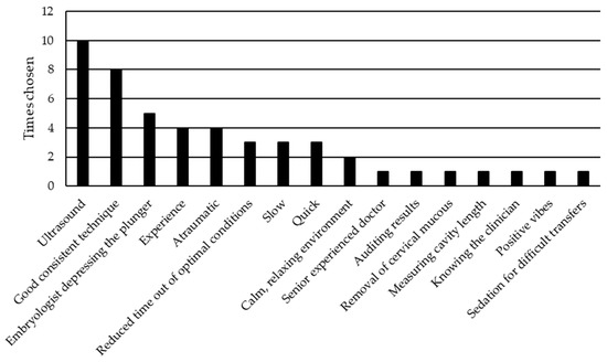 When the respondents were asked what they thought was the most important aspect with regard to ET, the majority of responses suggested guidance with ultrasound and good consistent technique (Figure 3). Interestingly, there were three responses stating that a slow steady transfer improves chances of success, whilst three other responses urged speedier transfers.