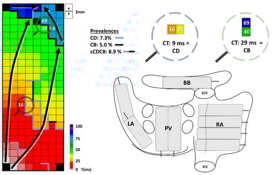 For each electrode the conduction time (CT) was calculated as the difference in LAT with the bordering right and lower electrodes, as illustrated in Figure 1. As in prior mapping studies, conduction delay (CD) was defined as CTs >6 and <12 ms, conduction block (CB) was defined as CTs >11 ms. These cutoffs for CB were determined, as explained in previous work, based on the slowest conduction during longitudinal propagation []. When CB lines connected with CD lines, this was labeled as a continuous conduction delay and block (cCDCB) line. These parameters are shown in detail in the upper right panel in Figure 1. All conduction parameters were calculated per mapping site (e.g., LA1, LA2) and then translated to an average, maximum or sum for the corresponding location (e.g., LA). Total activation time (TAT) and activation time (AT) for every location were determined by comparing the first and last activation of the corresponding mapping sites in relation to the bipolar reference electrode. At BB, as fiber direction in this location is known, we evaluated the direction of CB lines as being mostly perpendicular to, in parallel with, or diagonal on the fiber direction. If a perpendicular CB line completely isolated the right and left side of BB, this was scored as an isolating CB line.