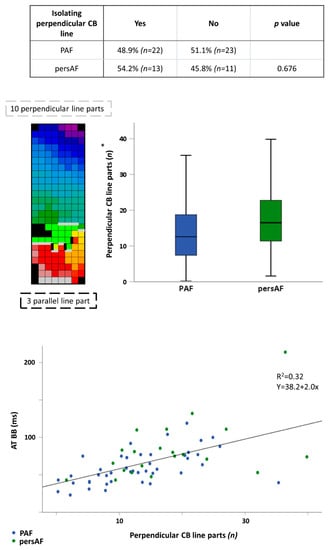 Conduction disorders particularly occurred at BB. Perpendicular orientation of the longest CB line at BB was more frequently present in patients with persistent AF (n = 19, 82.6%), than in patients with paroxysmal AF (n = 22, 52.4%), p = 0.028. There was no difference in prevalence of isolating CB lines (upper panel Figure 2). The exact number of perpendicularly orientated CB line parts was evaluated as explained in the left part of the middle panel of Figure 2. Patients with persistent AF had more perpendicularly orientated parts of CB line than paroxysmal AF patients (middle panel Figure 2; PAF: 13.0 ± 7.7, persAF: 18.3 ± 10.0, p = 0.045). The number of perpendicularly orientated parts of CB was correlated with AT of BB (lower panel Figure 4; rho 0.605, p < 0.0005).