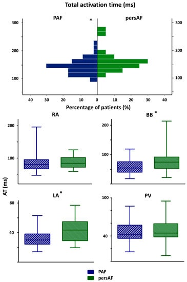 Paroxysmal vs. persistent AF patients: activation times. The upper panel shows the distribution of total activation time for the PAF group and persAF group. The lower panel depicts ATs for each location separately in the PAF and persAF group. BB: Bachmann’s bundle; LA: left atrium; PVA: pulmonary vein area; PA: paroxysmal AF; persAF: persistent AF; RA: right atrium; AT: activation time; * total activation time; p = 0.034, BB: p = 0.017, LA: p = 0.010.