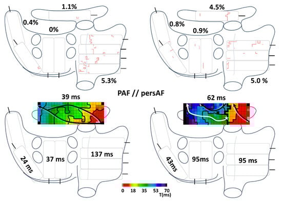 Typical paroxysmal and persistent AF patient. The distribution of CB prevalence (upper panel) and AT (lower panel) is seen in a PAF (left) and a persAF patient (right). In the lower panel, two activation maps are demonstrated at BB with 10 ms isochrones, arrows showing the direction of wavefront propagation and thick black lines indicating CB area. The paroxysmal AF patient, 69 years old, was diagnosed 3 months before he underwent mitral valve surgery. He had been experiencing palpitations for minutes to hours at a time and AF occurred during a cardiac exercise stress test while he experienced similar palpitations. The persistent AF patient, 64 years old, was diagnosed with AF 10 months before he underwent mitral valve surgery. As duration of AF was unknown at the time of diagnosis, an electrocardioversion was scheduled 2 months later, which was successful. The patient had two more AF episodes lasting longer than 7 days requiring electrocardioversion before surgery, which restored SR in both cases. CB: conduction block; PAF: paroxysmal AF; persAF: persistent AF; AT: activation time.