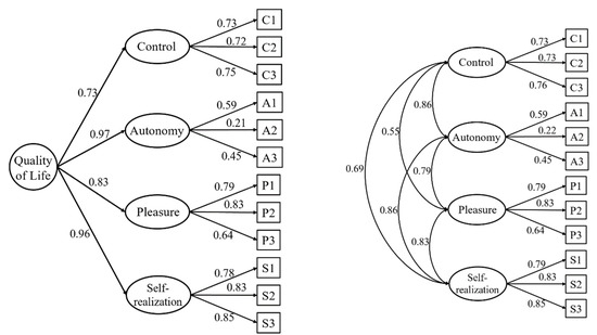 For the overall scale and the four first-order factors, both the alpha coefficient and the CRI were estimated. The alpha for the global measure of QoL was 0.833 (95% CI (0.831–0.834)), and the CRI was also very high (CRI = 0.932). Regarding the reliabilities of the four dimensions, all of them were adequate except the estimates of autonomy. In the case of control, the alpha was 0.709 (95% CI (0.705–0.712)) with a CRI = 0.784. Self-realization had an alpha of 0.816 (95% CI (0.813–0.818)) and a CRI of 0.865. Pleasure’s estimates of reliability were adequate: alpha = 0.695 (95% CI (0.691–0.698)), and CRI = 0.801. The two estimates of reliability, alpha and CRI, were inadequate for the autonomy dimension: alpha = 0.351 (95% CI (0.342–0.359)), and CRI = 0.394.