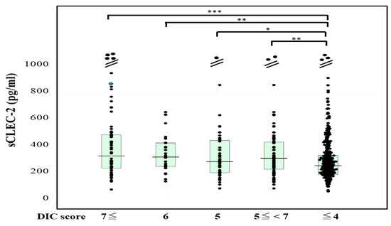sCLEC-2 levels in patients with DIC, those with pre-DIC and those without DIC. DIC, DIC score ≥ 7; pre-DIC, DIC score 5 or 6; without DIC, DIC score ≤ 4; * p < 0.05; ** p< 0.01; *** p < 0.001.