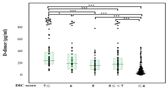 D-dimer levels in patients with DIC, those with pre-DIC and those without DIC. DIC, DIC score ≥ 7; pre-DIC, DIC score 5 or 6; without DIC, DIC score ≤ 4; * p < 0.05; *** p < 0.001.