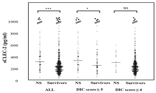 sCLEC-2 levels in survivors and non-survivors. NS; non-survivor; * p < 0.05; *** p < 0.001; NS. not significant.