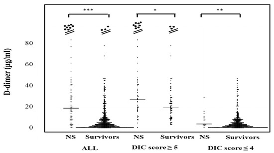 D-dimer levels in survivors and non-survivors. NS; non-survivor; * p < 0.05; ** p< 0.01; *** p < 0.001; NS. not significant.