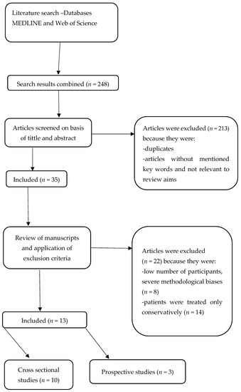 The results of the preliminary search of the above databases were 248 articles. Articles were excluded based on the above exclusion criteria, as were articles that did not contain the above keywords in their title and abstract and articles that were repeated across different databases. The above process narrowed the selection of literature to 35 articles, of which 13 were included in this literature review. The remaining 22 articles were excluded because the subject of the study was patients who had received transplants or patients undergoing peritoneal dialysis. Of the selected 13 articles, 3 were longitudinal studies and 10 of them were cross-sectional studies (Figure 1).