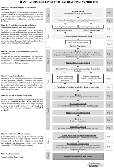To overcome this limitation, the instruments need to be translated and linguistically validated in the target languages for international studies on TBI outcome. The linguistic validation of instruments is challenging as it needs to address the cultural and conceptual differences between the respective language while maintaining the contents of each instrument on a conceptual level across the different languages [23]. A systematic review found that no standardized international guidelines exist for the linguistic validation of health-related outcome instruments [24]. Nevertheless, several guidelines and recommendations for iterative translation procedures are in use, published by the MAPI Research Trust [25], the International Society for Pharmacoeconomics and Outcomes Research (ISPOR) [26,27], and others [23,28,29]. Moreover, further research is addressing the issue of the cross-linguistic adaptation of PROMs [26], ClinRO and PerfO instruments [30], and clinical ratings (e.g., Reference [31]). To date, general principles include the following steps: