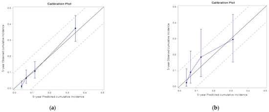 The model shows reasonable discrimination with Uno’s c-index of calibration of 0.8 (95% confidence interval [CI] 0.75–0.86). The bootstrap-corrected Uno’s c-index was 0.79 for internal validation (Figure 2a) and Uno’s c-index for external validation was 0.75 (95% CI 0.65–0.86) (Figure 2b) (Table 3). The calibration slopes of 1 (95% CI 0.84–1.16, bootstrap-corrected slope 0.85) and the calibration plot in the internal validation showed a good correlation. Moreover, the model showed good calibration in the external validation: the calibration slope was 0.9 (95% CI 0.49–1.3) even though the model tended to slightly underestimate the cumulative incidence for patients whose cumulative incidence at five years was between 0.1 and 0.2 in the external validation.