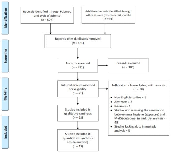 A systematic search was performed on the PubMed and Web of Science databases, with the following keywords: oral hygiene, dental deposit, OHI, PI, PSc, tooth brushing, interdental cleaning, dental visit, and MetS. While no date restrictions were imposed, the language was limited to English. The last search was on 17 March 2021. Details of the search strategy can be seen in Supplementary Table S1. Examination of reference lists of eligible studies and relevant systematic reviews were also conducted to identify further relevant studies.