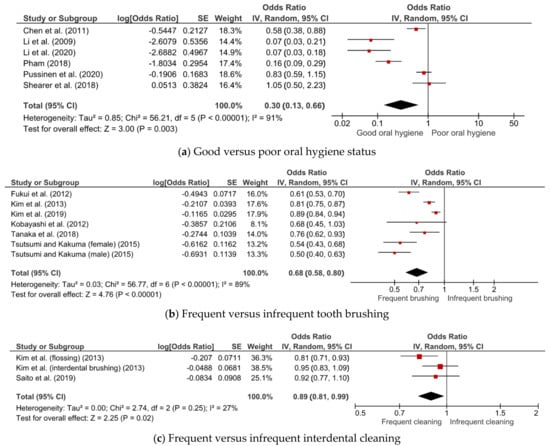 Meta-analysis of the associations of (a) oral hygiene status, (b) tooth-brushing frequency, and (c) interdental cleaning with metabolic syndrome.