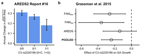 - Grassmann, F.; Harsch, S.; Brandl, C.; Kiel, C.; Nürnberg, P.; Toliat, M.R.; Fleckenstein, M.; Pfau, M.; Schmitz-Valckenberg, S.; Holz, F.G.; et al. Assessment of Novel Genome-Wide Significant Gene Loci and Lesion Growth in Geographic Atrophy Secondary to Age-Related Macular Degeneration. JAMA Ophthalmol. 2019, 137, 867. [Google Scholar] [CrossRef]