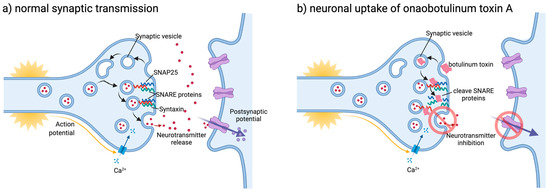 Mechanism of action of botulinum toxin [12]. (a) Normal synaptic transmission; arriving active channel opens voltage-gated calcium channels, allowing influx of calcium. Calcium allows synaptic vesicle docking via SNARE proteins, neurotransmitter release, and activation of post-synaptic potential. (b) Neuronal uptake of onabotulinumtoxinA, internalisation of botulinum toxin via synaptic vesicle, and cleavage of SNAP-25 protein causing inhibition of neurotransmitter release.