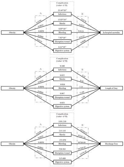 The marginal effects of obesity on outcomes are shown in Figure 2. Obesity increased in-hospital mortality by 66.65 × 10−5%, length of hospital stay by 0.32 days, and total hospital charges by 2384 US dollars. Obesity increases the risk of these outcomes mainly by triggering the complication of infection (33.44 × 10−5%, 0.160 days, and 1181 US dollars, respectively).