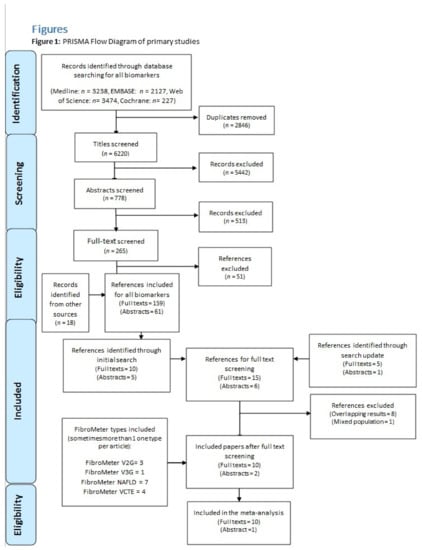 The following are available online at https://www.mdpi.com/article/10.3390/jcm10132910/s1, Figure S1: Graphical summary of the methodological quality of included studies using the QUADAS-2 tool, Figure S2: Methodological quality of each of the included studies per domain of the QUADAS-2 tool, Figure S3: Forest plot FibroMeter V2G, Figure S4: Forest plot FibroMeter NAFLD, Figure S5: Forest plot FibroMeter VCTE, Table S1: PRISMA DTA Checklist, Table S2: OVID via MEDLINE search strategy, search tables for other databases were similar, Table S3: Correspondence between the NASH CRN and the METAVIR systems, Table S4: Number of included studies in three different meta-analyses all with target condition advanced fibrosis (F ≥ 3), Table S5: Liver biopsy characteristics:, Table S6: Summary of accuracy of FibroMeter VCTE, V2G and NAFLD for advanced fibrosis, presented in AUC, sensitivity and specificity. Including results after sensitivity analysis