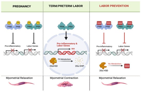 P4 is a pro-gestational hormone, which maintains uterine quiescence for most of pregnancy by inhibiting the transcription of labor-associated genes in the myometrium. These genes include gja1 (Connexin 43), otr (oxytocin receptor), and ptgs2 (cyclooxygenase), which encode uterine activation proteins; nfkb (nuclear factor kappa-B), ilb1b (IL-1β, ccl2 (MCP-1), and cxcl8 (IL-8), which encode proteins involved in cytokine and chemokine signaling. Myometrial activation and the initiation of labor requires withdrawal of P4, which in most viviparous species is achieved by a fall in peripheral P4, a key trigger of parturition. In contrast, circulating P4 levels remain elevated in women at term []. Yet, blocking P4 action at any time during human pregnancy by administration of the specific antagonist, RU486, induces preterm labor. Therefore, it has been hypothesized that a ‘functional withdrawal’ of P4 occurs in the human myometrium, whereby uterine smooth muscle cells become resistant to the pro-gestational actions of P4, inducing labor onset [,].