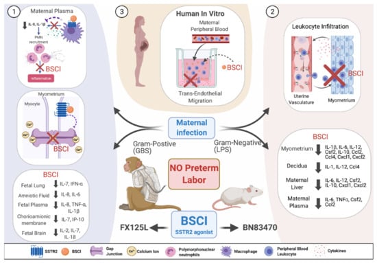 Conceptual model showing BSCI actions in vivo and in vitro as a preterm labor therapeutic. (1) In vivo administration of BSCI (FX125L) using a nonhuman primate model of preterm labor induced by Group B Streptococcus (GBS) led to the powerful suppression of uterine activity and a complete blockade of PTB. BSCI treatment led to reduced maternal plasma IL-8 and IL-1β inhibited myometrial gap junction protein connexin 43 mRNA levels and reduced pro-inflammatory cytokines in amniotic fluid, chorioamniotic membrane, fetal plasma, lungs, and brain compared to GBS alone []. (2) Prophylactic in vivo administration of BSCI (BN83470) decreased LPS-induced PTB in pregnant mice, significantly inhibited neutrophil infiltration in the mouse myometrium, and significantly attenuated multiple cytokine/chemokine expression in maternal tissues (myometrium, decidua, plasma, and liver) []. (3) We hypothesize that pre-treatment with BSCI (FX125L) of human primary leukocytes isolated from peripheral blood of pregnant people will also prevent the in vitro trans-endothelial migration of neutrophils towards media containing multiple cytokines secreted from the pregnant human decidua and myometrium. Note: this figure was created with Biorender.com.