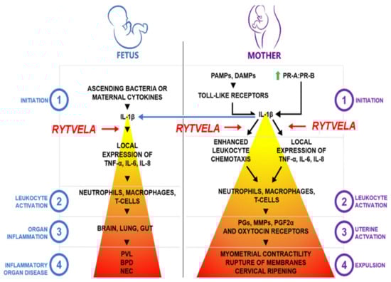 Conceptual model for the role of IL-1β in preterm labor and fetal inflammation. This model illustrates that IL-1β is the apex cytokine in the inflammatory cascade of preterm birth and fetal inflammatory injury, thereby presenting an attractive molecular target for drug discovery. PR-A/PR-B, P4 receptors A and B; PGs, prostaglandins; MMPs, matrix metalloproteinases; PGF2α, prostaglandin F2α; PLV, periventricular leukomalacia; BPD, bronchopulmonary dysplasia; and NEC, necrotizing enterocolitis. Increasing color intensity represents increasing inflammatory response. The level where Rytvela acts is identified by red arrows. Courtesy of Han Lee.
