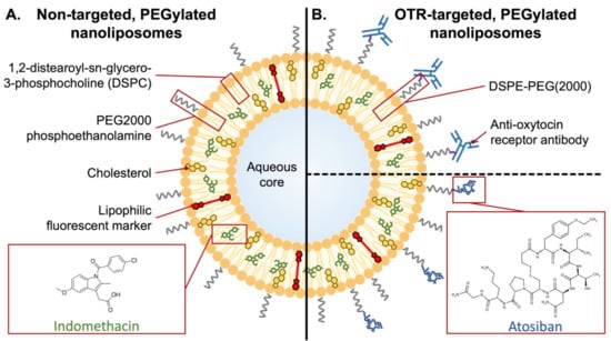 Schematic of non-targeted and uterine-targeted nanoliposomes. (A) The nanoliposomes are composed primarily of 1,2-distearoyl-sn-glycero-3-phosphocholine (DSPC) and cholesterol but also include PEGylated lipid (PEG2000 phosphoethanolamine; ~2% of total lipids), which produces steric hindrance that improves circulation time, but without a targeting moiety. Indomethacin and lipophilic markers partition into the lipid bilayer. (B) Oxytocin receptor (OTR)-targeted nanoliposomes, whereby PEGylated 1,2-distearoyl-sn-glycero-3-phosphoethanolamine (DSPE, ~2% of total lipids) is conjugated to either an OTR-binding antibody (via maleimide linkage) or peptide (Atosiban, via amine linkage).