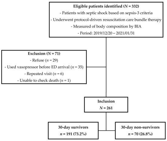 Patient flow diagram. BIA, Bio-electrical impedance analysis; ED, emergency department. Patients with septic shock based on sepsis-3 criteria who underwent protocol-driven resuscitation care bundle therapy and measurements of body composition by Bio-electrical impedance analysis. From December 2019 to January 2021, 261 patients were enrolled and the overall 30-day mortality rate was 26.8%.