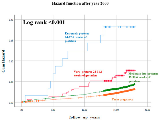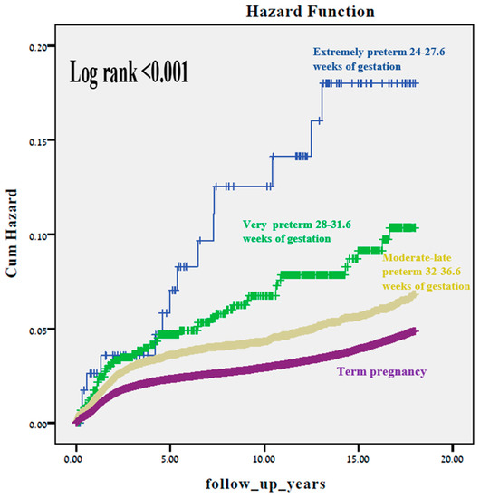 This large retrospective cohort study inspected the long-term incidence of neurologic-related hospitalizations laminated by extremity of prematurity and compared to term offspring. We concluded that decreasing gestational age at birth increased neurological morbidity, as shown in both the Kaplan–Meier survival curve and the Cox regression analysis model. The slope for hospitalization rate according to gestational age attenuated beyond 25 weeks of gestation; therefore, 25 weeks could be determined as the critical threshold below which the risk of neurological morbidity significantly rises, with another threshold effect seen between 29 and 30 weeks, showing a further reduction in long-term neurological morbidity.