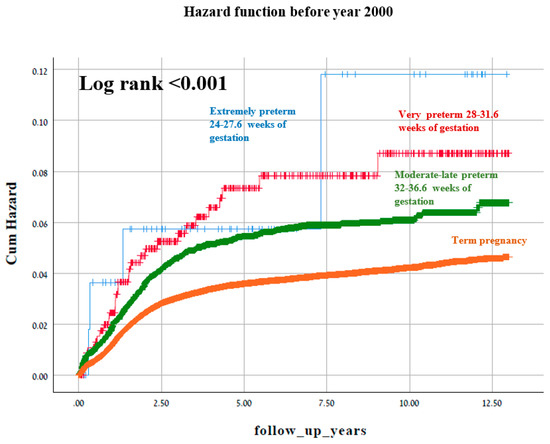 A Kaplan–Meier survival curve demonstrating the cumulative incidence of long-term neurologic-related hospitalizations according to gestational age before year 2000 (Log-Rank test p < 0.001).