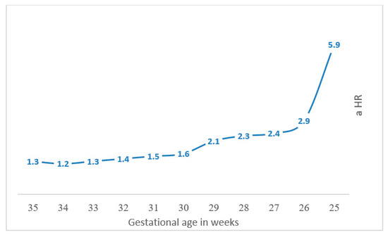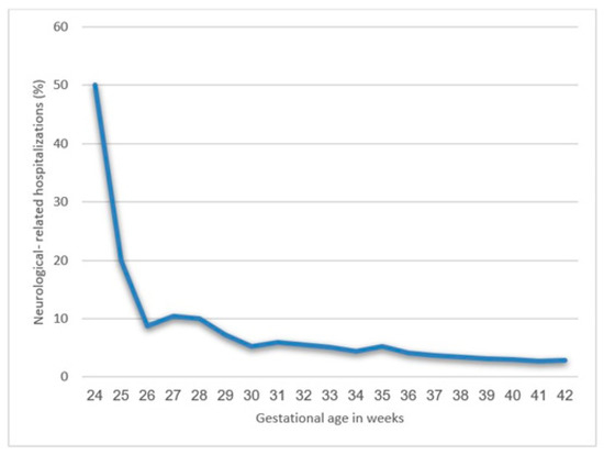 Figure 4 illustrates univariate analysis of total neurological morbidity according to gestational week at delivery. As seen, the gestational week at birth and neurological morbidity are manifested in an inverse relationship. Searching for a specific threshold, the slope for hospitalization rate attenuated beyond 25 weeks of gestation (Figure 2).