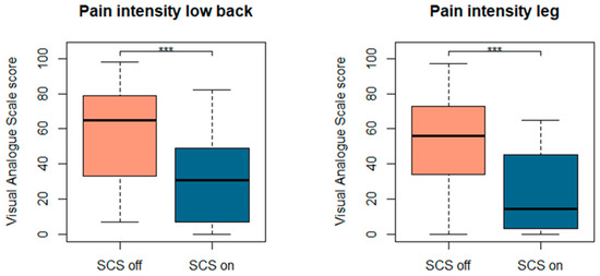 Pain intensity scores for lower back (left) and leg (right) during SCS off and SCS on conditions. Abbreviations. SCS: spinal cord stimulation, *** is denoting a statistically significant difference in pain intensity scores between SCS on and off states.