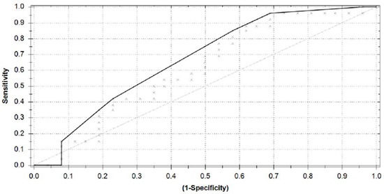 Model performance is presented in Table 1. The model has an accuracy of 56% with a sensitivity of 62% (95% CI from 41% to 79%) and a specificity of 50% (95% CI from 30% to 70%). The area under the curve equals 0.62 (Figure 2).