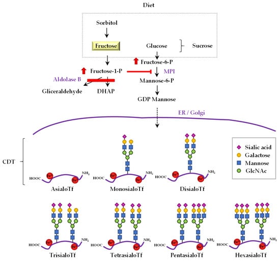 The link between fructose metabolism and the profile of sialotransferrins in hereditary fructose intolerance. Dietary sorbitol and sucrose, i.e., a disaccharide formed by glucose and fructose, are precursors of fructose. The catabolic pathway of dietary fructose, sucrose and sorbitol is altered in patients with hereditary fructose intolerance (HFI). In aldolase B deficiency, the catabolism of fructose-1-P (F1P) is impaired (red bar), and this molecule is accumulated largely in the liver of HFI patients. Consequently, HFI patients have an abnormal transferrin (Tf) glycosylation pattern because of F1P-mediated competitive inhibition of mannose-6-phosphate isomerase (MPI). Tf exhibits different isoforms depending on the number of sialic acid residues present on its oligosaccharide chain; asialo-, monosialo-, disialo-, trisialo-, pentasialo-, and hexasialo-Tf. The sum of asialo-, monosialo-, and disialo-Tf is called carbohydrate-deficient Tf (CDT).