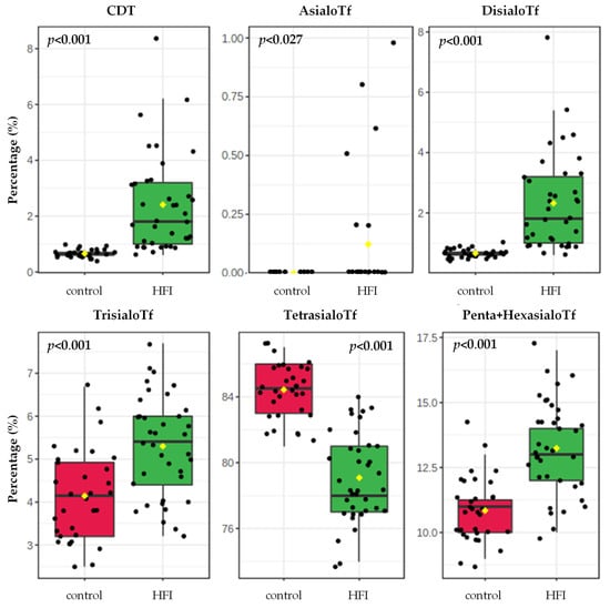 Sialotransferrin (sialoTf) isoform percentages in HFI patients (n = 37) and in their respective healthy controls (n = 32). Differences in continuous variables between HFI and their controls were calculated by using the Student’s t-test.