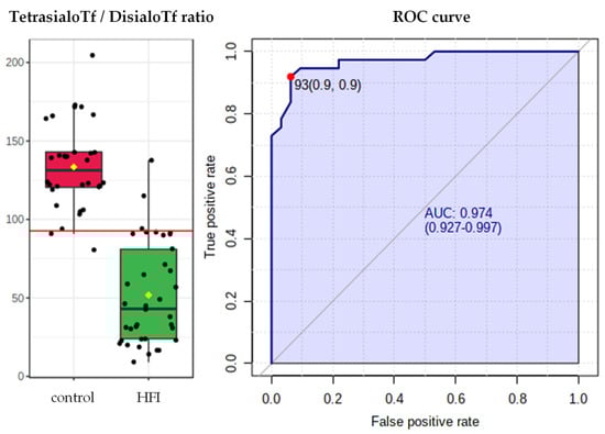 TetrasialoTf-to-disialoTf ratio and ROC curve in HFI patients (n = 37) and in their respective healthy controls (n = 32). AUROC = 0.97, 92% sensitivity, 94% specificity, 14.7 positive likelihood ratio, 0.09 negative likelihood ratio and 93% accuracy with a cut-off point of 93.