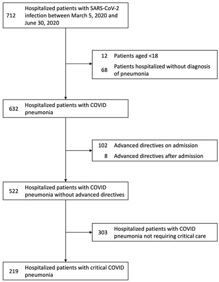 Of the 712 patients hospitalized due to COVID-19 from 5 March 2020 to 30 June 2020 in the city of Louisville, KY, our study included a total of 522 patients with COVID-19 pneumonia (Figure 1). Due to DNR and DNI advanced directives, 67 critically ill patients and 43 non–critically ill patients were excluded. Our study included a final total of 219 critically ill and 303 non–critically ill COVID-19 pneumonia patients. The main characteristics of these patients are shown in Table 1.