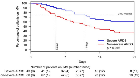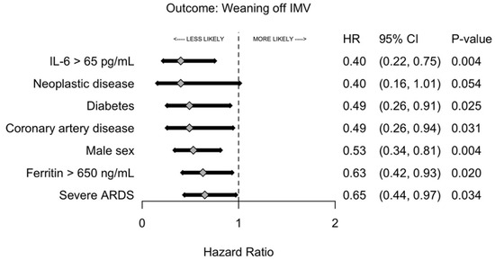 Critically ill patients exhibited a median arterial partial pressure of oxygen/fraction of inspired oxygen (PaO2/FiO2) ratio of 174, which is consistent with the oxygenation level of moderate ARDS. Precisely 38% of these patients had severe ARDS. The univariate analysis of risk factors associated with the weaning off the IMV is shown in Supplementary Table S1. IL-6 > 65 pg/mL and male sex were associated with the lowest statistically significant likelihood of weaning off IMV (Figure 2). Twenty-five percent of patients with severe ARDS weaned off IMV within eleven days versus five days for those without severe ARDS (Figure 3).