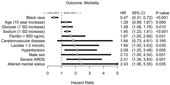 The overall mortality was 20% versus 1% for critically and non–critically ill patients, respectively. Among those who expired, critically ill patients were 17 years younger than those who were non–critically ill, and the male to female ratio was 2.68. The univariate analysis of risk factors associated with hospital mortality is shown in Supplementary Table S2. After stepwise selection for time to hospital mortality and adjustment by age, African American patients had a 53% lower risk of death (Figure 4). Additionally, arterial hypertension, severe ARDS, and an increase in serum sodium were significantly associated with risk of hospital mortality. Mortality difference between patients with and without severe ARDS was minimal within the first seven days but became substantially wider thereafter. By Day 14, 12% of patients without severe ARDS expired compared with 31% of patients with severe ARDS, p = 0.009 (Figure 5).