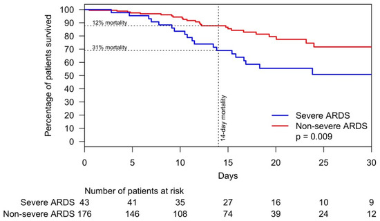 Inflammatory laboratory values of lactate, ferritin, interleukin-6 (IL-6), D-dimer, and c-reactive protein (CRP) were dichotomized into high/low values based on receiver operating curve (ROC) values that maximized sensitivity and specificity to predict in-hospital mortality. Time-to-event data were represented by Kaplan–Meier curves split by severity of ARDS. Log-rank tests were performed for unadjusted comparisons. To determine protective and risk factors for time to event data, multivariable, stratified Cox proportional hazards regressions with cluster-robust standard errors were performed. Variables were selected through forward and backward stepwise selection, based on minimizing the Akaike information criterion (AIC). The variables used in the selection process were (i) patient demographics of age, sex, race, and ethnicity; (ii) history of the following variables: neoplastic disease within the past year, renal disease, heart failure, chronic obstructive pulmonary disease, smoking history, diabetes, obesity, hypertension, hyperlipidemia; (iii) standardized values of temperature, respiratory rate, mean arterial pressure, heart rate, blood urea nitrogen (BUN), serum glucose, serum sodium, and hematocrit; (iv) dichotomized laboratory values of IL-6, CRP, d-dimer, ferritin, and lactate; and (v) exam findings of altered mental status and computed tomography (CT) or chest x-ray findings of pleural effusion and severe ARDS. Any p-value less than 0.05 was considered statistically significant. All analysis was performed in R version 3.5.1. (Vienna, Austria.)
