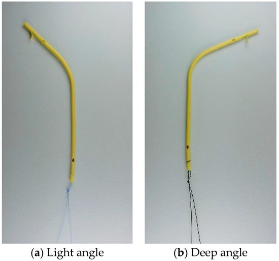 Commercially available inside stents (ThroughPass IS, Gadelius Medical K.K., Tokyo, Japan). There are two types of central bends, light angle (a) and deep angle (b). The angles of central bends were 34 degrees in the light angle and 75 degrees in the deep angle. The retrieval thread attached to the distal end was made of Nylon and 10 cm long.