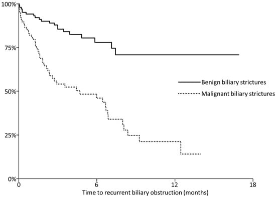 Kaplan-Meier curves of recurrent biliary obstruction in benign (solid line) and malignant (dotted line) biliary strictures.